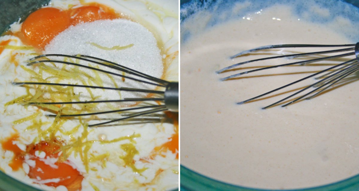 Śmietanę z jajkami ubij za pomocą miksera. Stopniowo dodawaj mąkę, cukier i wanilinę. Dodaj też skórkę z cytryny.