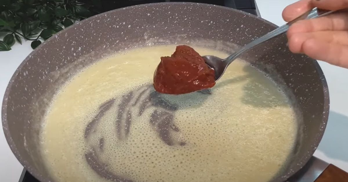 W rondelku rozpuść masło na niewielkim ogniu. Jeśli chcesz możesz dodać odrobinę warzyw do powstałego kremu. Przelej masło na patelnię i dodaj mąkę. Zrumień ją na złoty kolor, następnie dodaj i rozpuść w maśle koncentrat pomidorowy. Dokładnie wymieszaj.