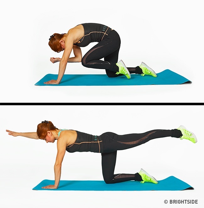 Stań na czworaka, lewą nogę i prawą rękę wyciągnij do linii prostej, następnie powoli zginaj je, tak by prawym łokciem dotknąć lewego kolana. Wyprostuj ponownie, po czym zmień nogę i rękę. Wzmocnisz tułów, biodra, znaczną część mięśni pleców, pośladki oraz talie.