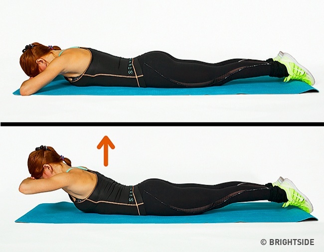 Połóż się na brzuchu a ręce ugnij pod twarzą. Górną część ciała podnieś tak wysoko jak potrafisz. Wytrzymaj w takiej pozycji kilka sekund. Pomału wróć do pozycji wyjściowej. To ćwiczenie korzystnie działa na kręgosłup.