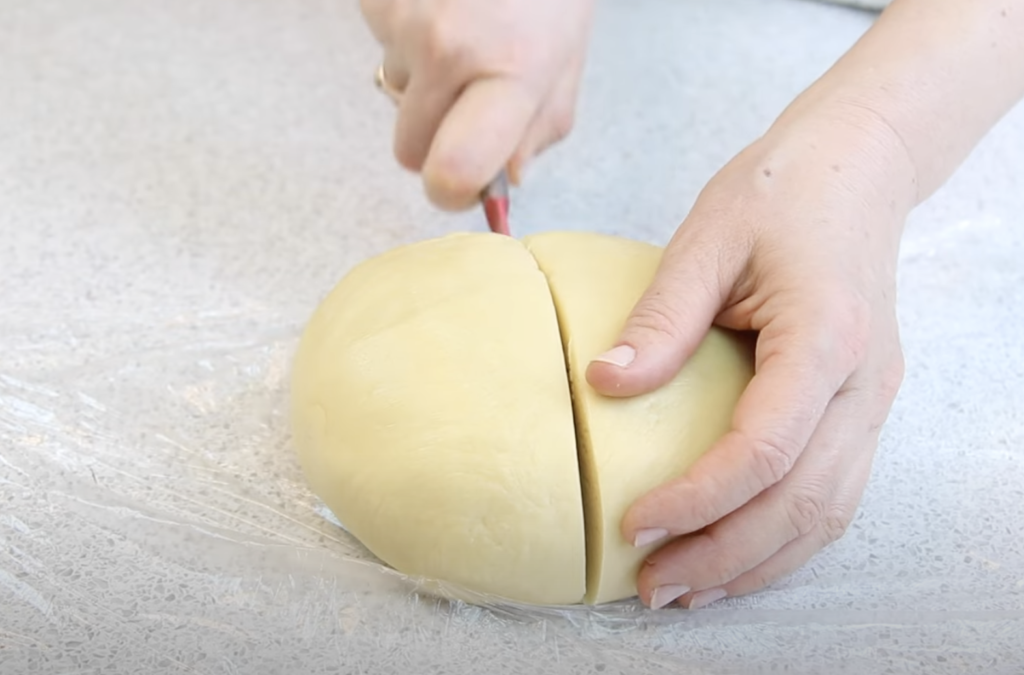 W kolejnym kroku należy owinąć powstałą mieszankę folię spożywczą i włożyć taki pakunek do lodówki. Ciasto owinięte w folię spożywczą powinno pozostać w lodówce przez około 40 minut. Po wyjęciu ciasta z lodówki należy rozwinąć je, a następnie przekroić na dwie równe części.