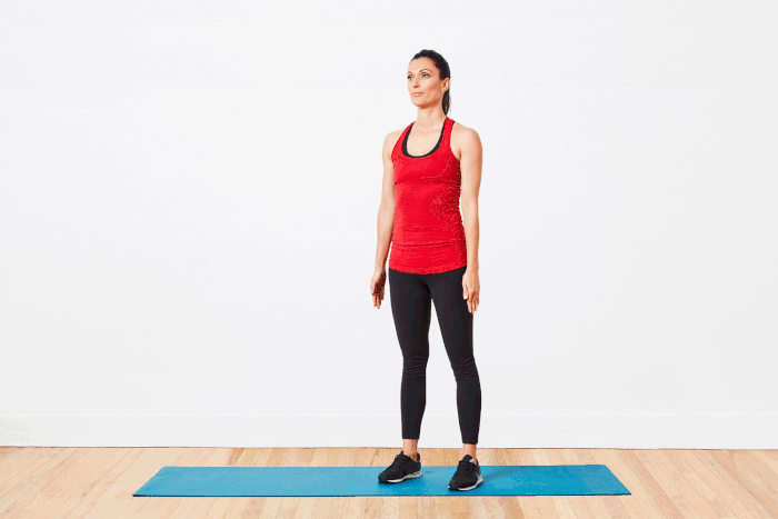 Wykonaj przysiad podstawowy poprzez ustawienie się szeroko na macie, trzymanie hantli w rękach, zegnij kolana tak, jakbyś chciał usiąść na krześle, wyciągnij klatkę piersiową i ręce do przodu. Upewnij się, że ciężar ciała jest podciągnięty do pięt, a kolana nie wystają poza palce. Powtarzaj ćwiczenie przez jedną minutę.
