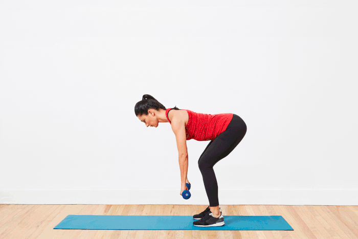 Wykonaj martwy ciąg poprzez ustawienie się na macie, ustawienie stóp na wysokość bioder, trzymanie hantli przed biodrami z dłońmi skierowanymi w stronę ud, pochylając się do przodu, wyciągając ręce przed siebie, tak jakbyś chciał upuścić hantle na stopy. Wykonaj ćwiczenie tak, jakbyś chciał podciągnąć pupę do góry, po czym wróć do pozycji wyjściowej. Trzymaj hantle blisko ciała, a kręgosłup w pozycji neutralnej podczas ćwiczenia.