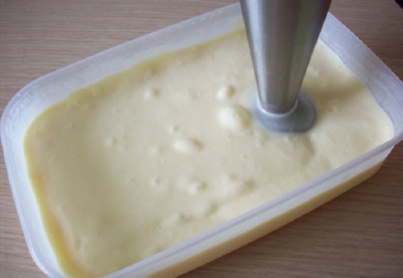 Zagotuj składniki razem, pamiętając o ciągłym mieszaniu. Poczekaj, aż zgęstnieją. Ubij śmietanę i dodaj ją do masy. Wymieszaj wszystko razem, a następnie włóż do lodówki. Aby uzyskać puszystą masę bez grudek, co godzinę ją mieszaj.