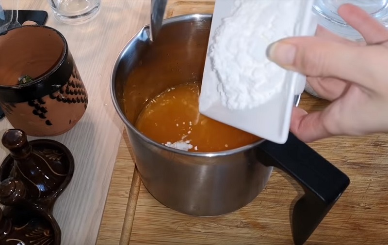 Następnie przelej do garnka i dodaj skrobie, cukier i wszystko dokładnie wymieszaj, nie może być grudek.