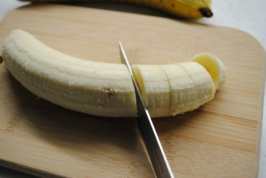 Następnie, spotkaj się z bananem! Obierz go, pokrój w krążki i dołącz do truskawek.