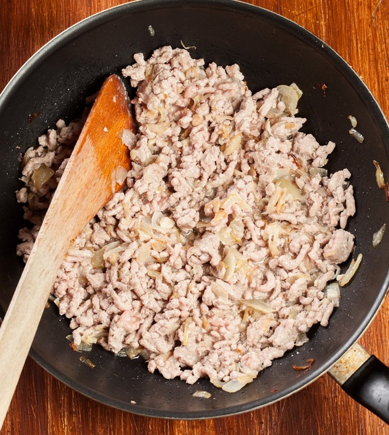 Na patelni rozgrzej olej. Cebulę drobno posiekaj, przyrumień na gorącym tłuszczu. Następnie dodaj mięso i smaż, często mieszając, na niewielkim ogniu.