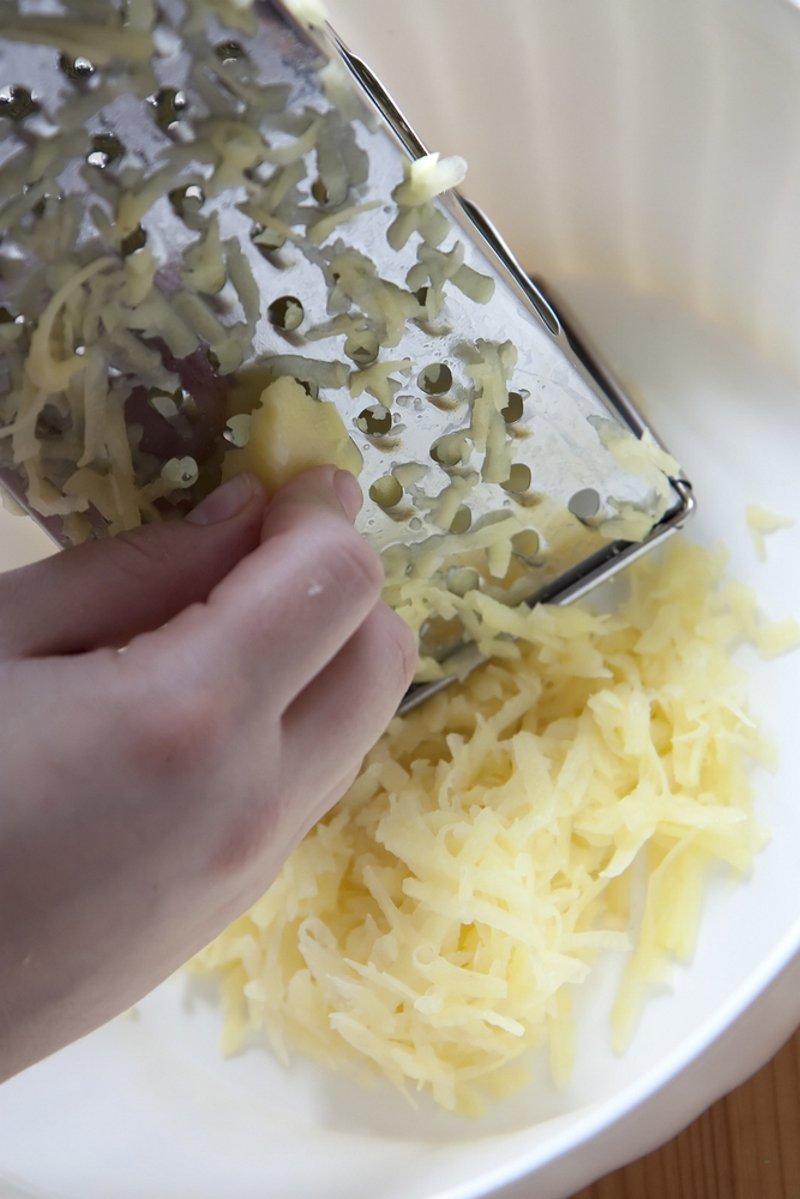 Do smażonego mięsa dodaj starte ziemniaki. Dopraw farsz do smaku solą i pieprzem. Możesz oczywiście dorzucić swoje ulubione przyprawy! Wymieszaj dokładnie. Ubij jajka, stopniowo dodając mleko. W międzyczasie nagrzej piekarnik do 180 stopni Celsjusza.