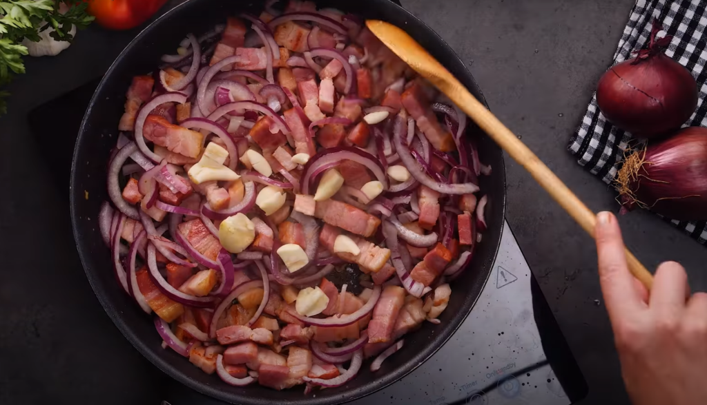 Czyścimy czerwoną cebulę, kroimy na pół-pierścienie i wkładamy do patelni na boczek. Posolić, wymieszać i chwilę razem smażyć. Na koniec dodaj pokrojony czosnek.